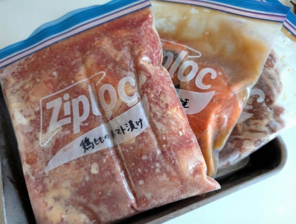 私は、スーパーから帰ってきた流れでお肉をパックから出して、袋に入れて、調味料を入れる。これだけやっちゃいます。