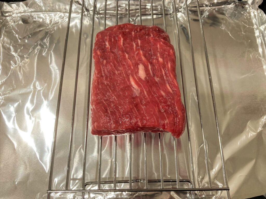 ヘルシオの角皿に網をのせ、下味をつけた牛肉を置きます。