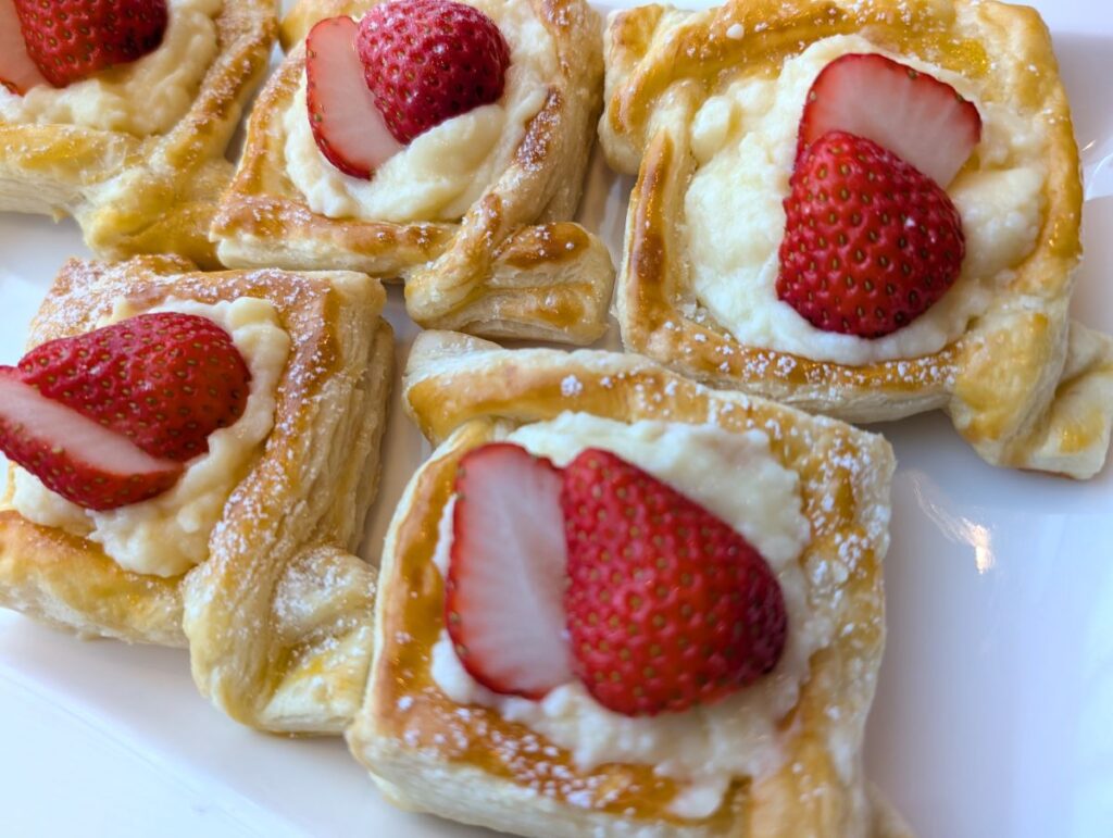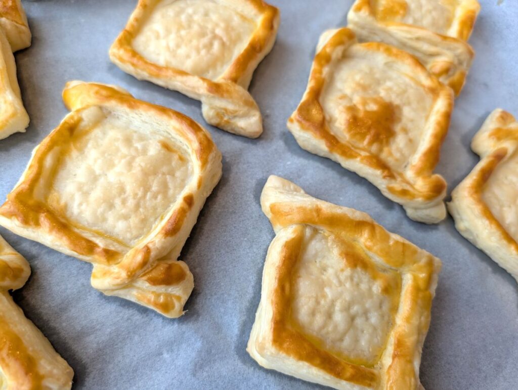 冷めたパイ生地は中央のふくらみをつぶしてから、冷やしておいたカスタードクリームをたっぷりのせ、半分にカットしたいちごをトッピングします。