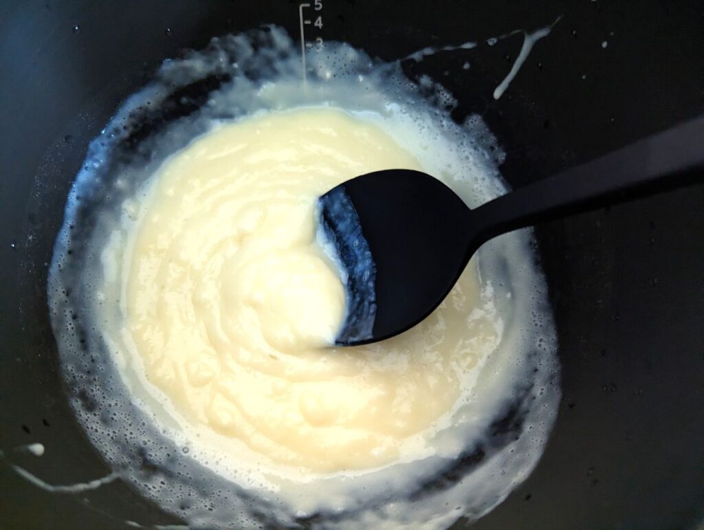 【ホットクックA】内鍋に薄力粉、砂糖を入れ、牛乳を少しずつ加えて溶きのばしてから卵を加えて混ぜ、カスタードクリーム(No.109)のメニューで加熱スタート。