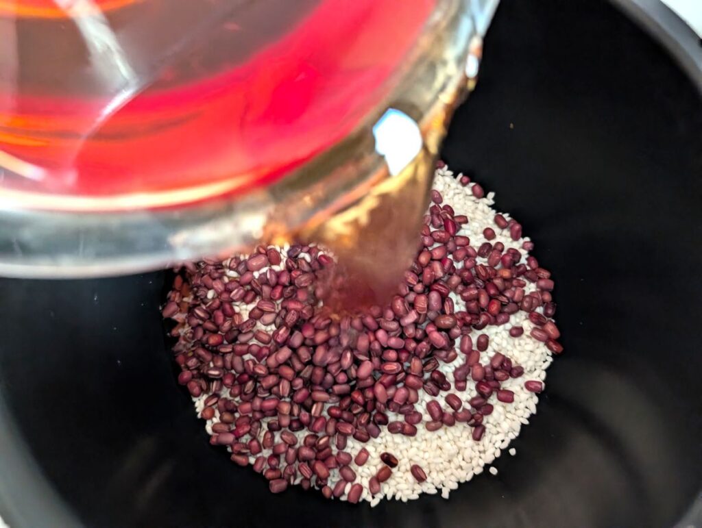 先ほど冷ましておいた小豆の茹で汁に水を足して、合計400mlにしたものを加えます。