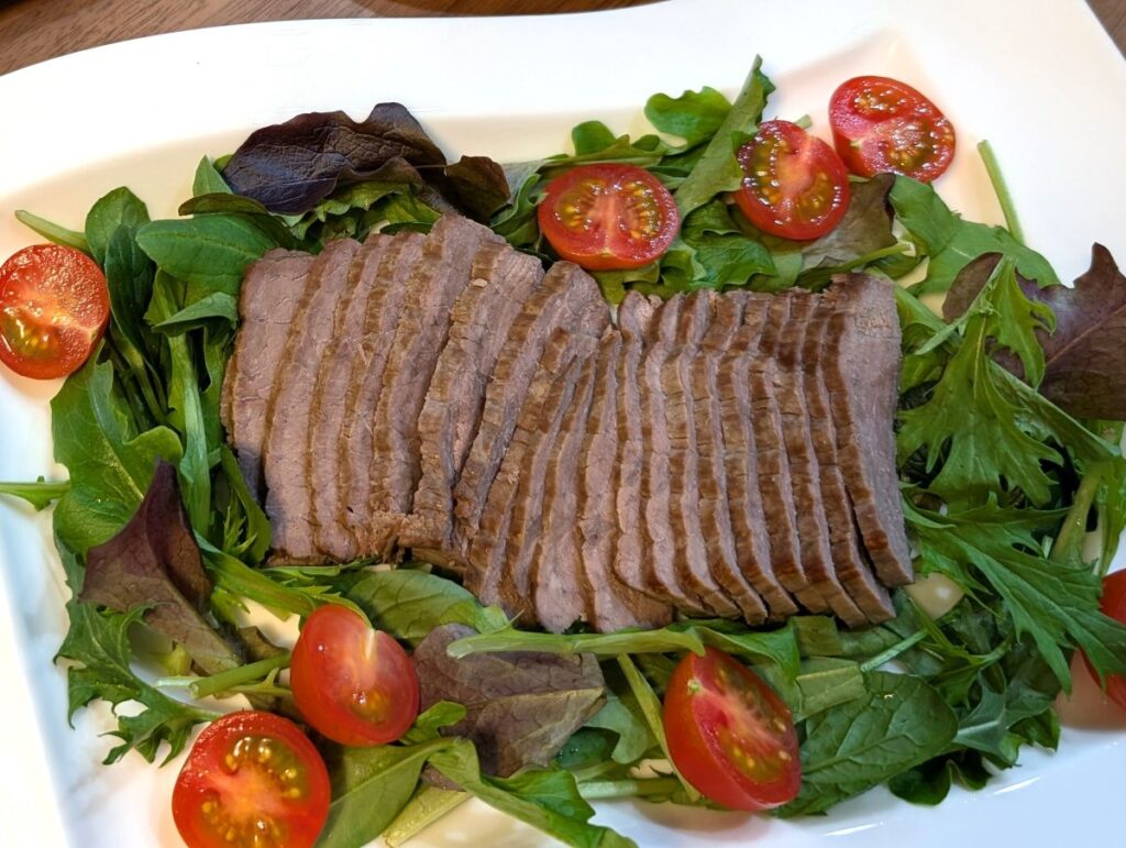ローストビーフを薄く切り分け、ベビーリーフと一緒に盛り付けます。